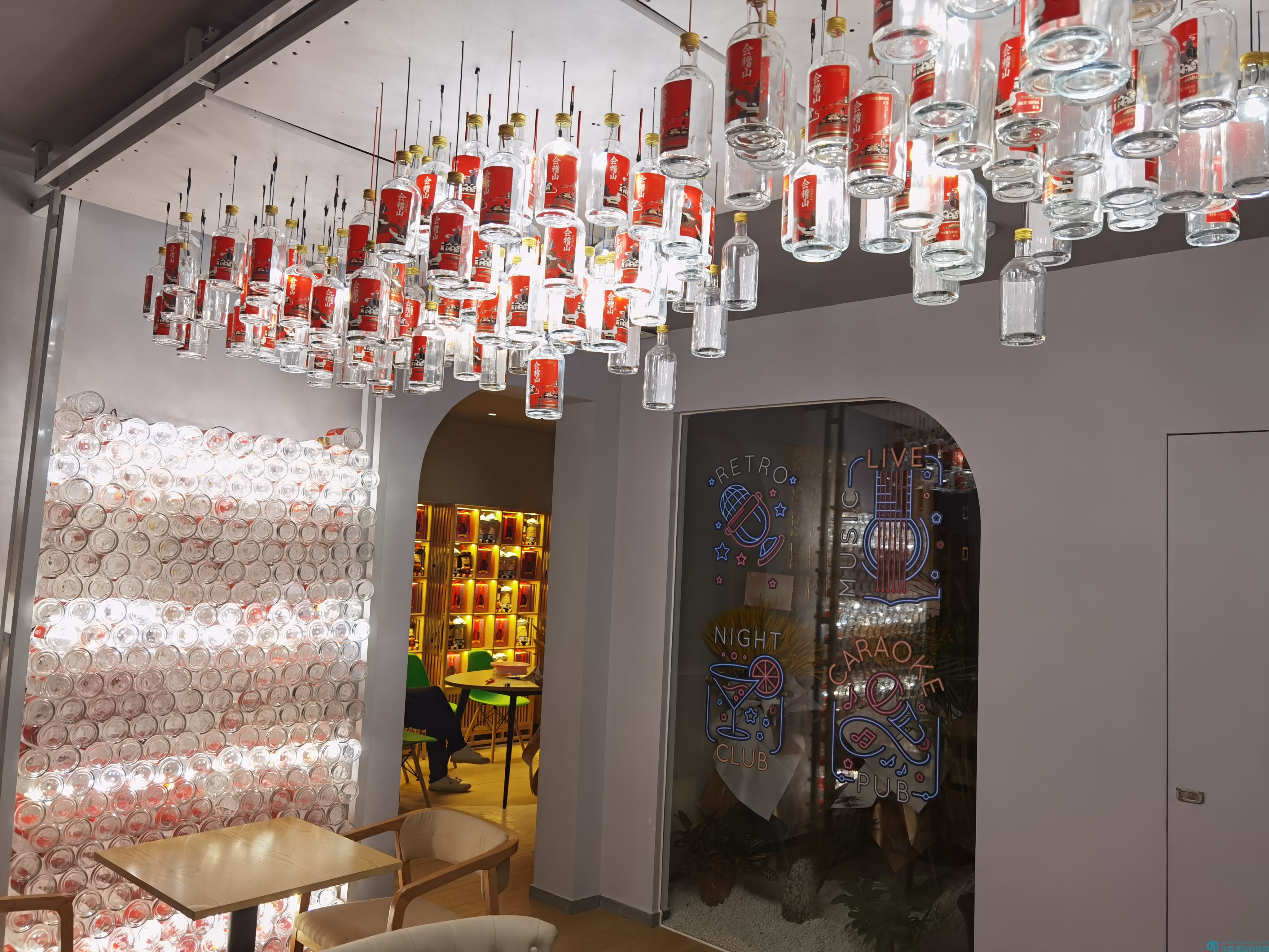 在室內(nèi)裝飾方面,除了有當(dāng)下流行的星空吊頂營造酒吧氛圍外,也創(chuàng)意十足地用會稽山1743黃酒瓶做成了墻壁裝飾和吊燈,別有一番中國古韻流轉(zhuǎn)其中。