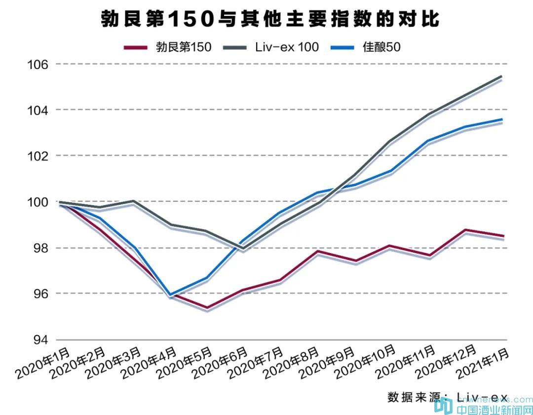 2020年,雖然行業基準指數Liv-ex 100和追蹤波爾多一級酒表現的Liv-ex Fine Wine 50指數分別上漲了5.4%和3.6%,但勃艮第150指數仍為負值,下降1.5%。