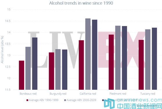 倫敦國際葡萄酒交易所(Liv-ex)的數(shù)據(jù)表明,在過去的 30 年里,精品葡萄酒中的酒精含量一直在上升。從 2020 年起,Liv-ex 開始記錄和驗(yàn)證葡萄酒的酒精含量值。迄今為止,它已經(jīng)記錄了35000款葡萄酒的酒精含量,其中近20000種已經(jīng)過倉儲(chǔ)團(tuán)隊(duì)的核對,他們對葡萄酒一一進(jìn)行了檢查。