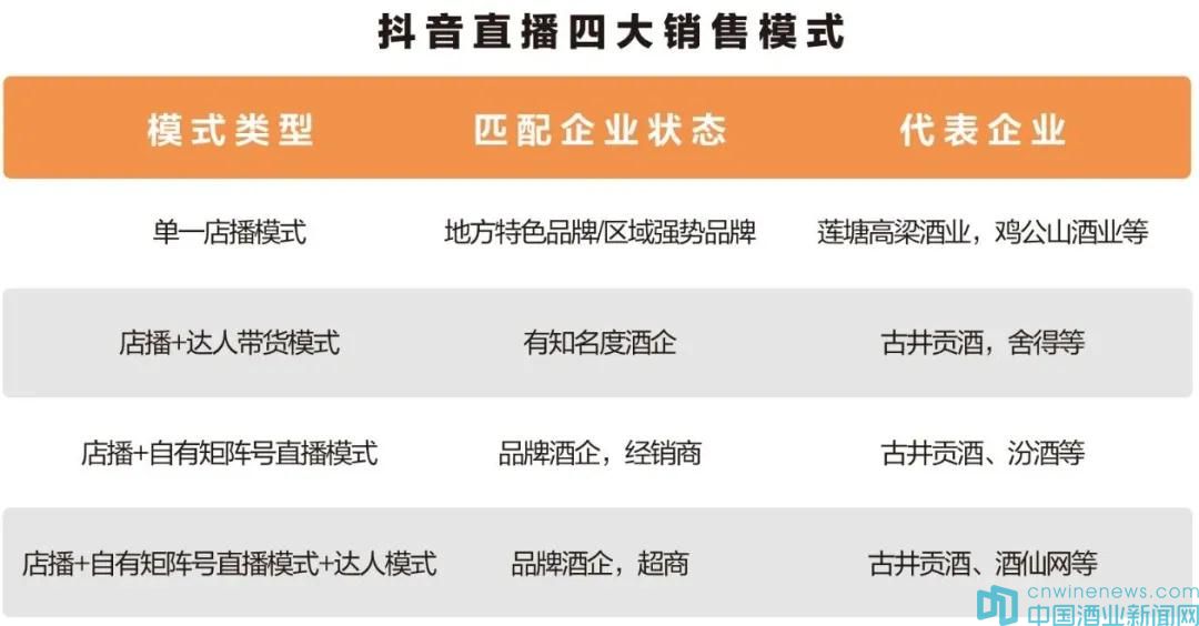 據統計,目前中國酒類抖音直播銷售呈現四大主導模式,不同的企業狀態或類型,匹配不同的直播銷售模式。