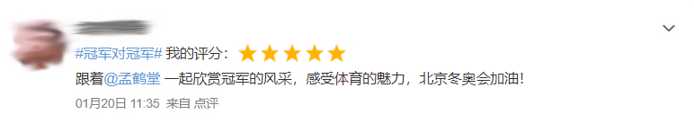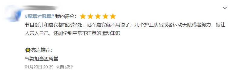 短道速滑冠軍韓天宇、短跑冠軍謝震業,冰球運動員黃滟、國家女子曲棍球隊隊長崔秋霞,冰壺冠軍王紫悅、“九球天后”潘曉婷等冠軍亮相節目,開啟跨項比拼。節目中,冠軍們還分享了各自的成長故事。“手指骨折,但是每天的訓練還得堅持去做!”“你每付出一分鐘,都是你未來在賽場上的底氣!”“就像釀造一杯美酒,冠軍的養成離不開堅持!”······每一次講述、每一個細節都深深打動了萬千觀眾和網友。
