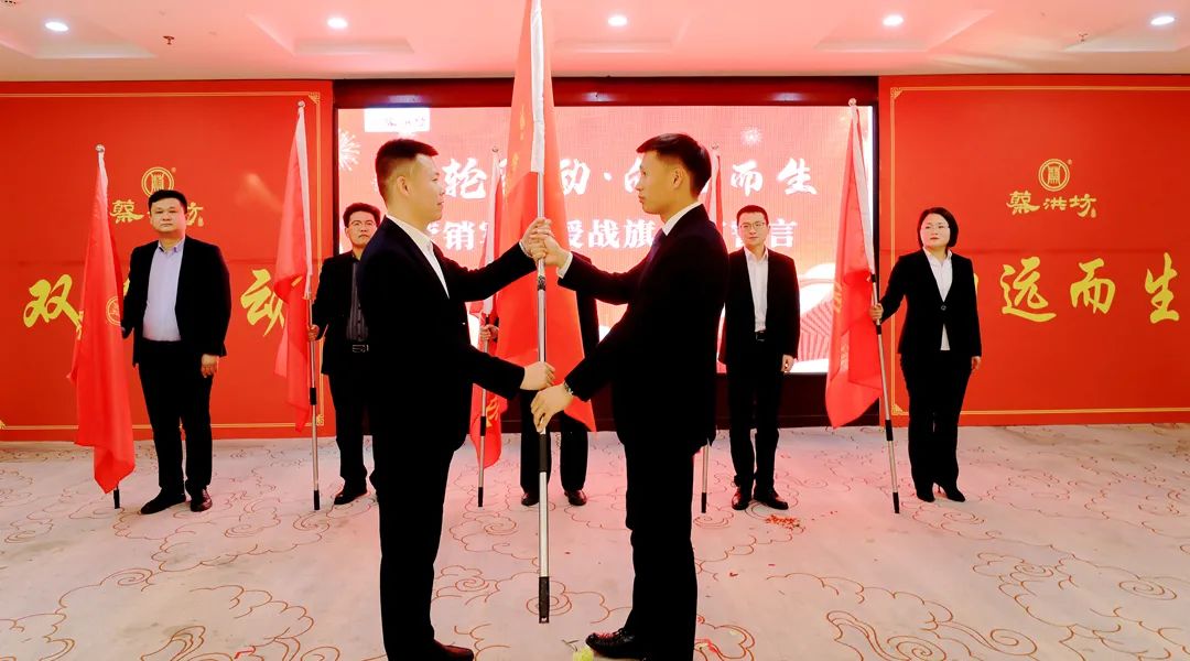 吉時(shí)吉刻,現(xiàn)場頓時(shí)鑼鼓喧天。大者思遠(yuǎn),能者任鉅,莊嚴(yán)而神圣的授戰(zhàn)旗儀式更是鼓舞人心。蔡洪坊酒銷售公司總經(jīng)理佟樹偉走上舞臺為濃香事業(yè)部、醬香事業(yè)部及各營銷區(qū)域、營銷板塊負(fù)責(zé)人鄭重授戰(zhàn)旗。之后,他鄭重地從蔡洪坊酒業(yè)總經(jīng)理王永華手中接過銷售公司戰(zhàn)旗。現(xiàn)場,鼓聲隆隆,口號嘹亮,戰(zhàn)旗飄飄,氣氛熱烈而莊重,將年會氣氛推向最高潮。