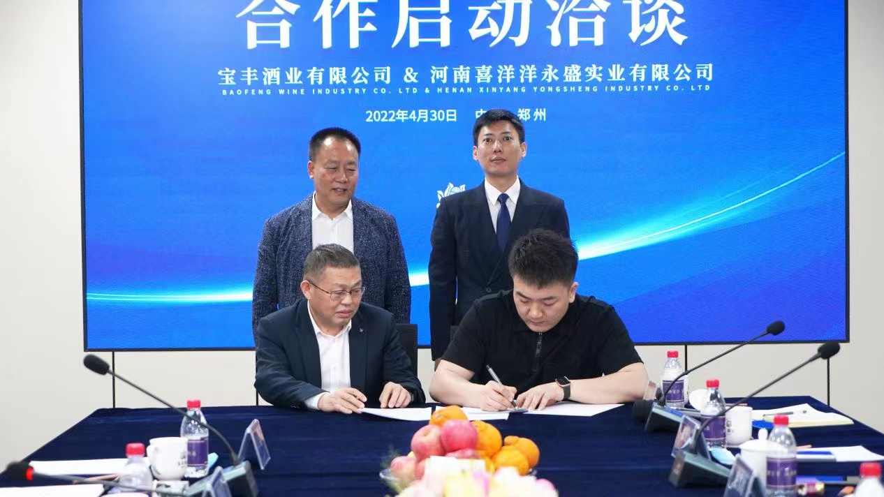 2022年4月30日,寶豐酒業與河南酒業大商——河南喜洋洋永盛實業有限公司戰略合作簽約儀式在寶豐酒業銷售公司營銷中心成功舉行,并進行了友好深度洽談。