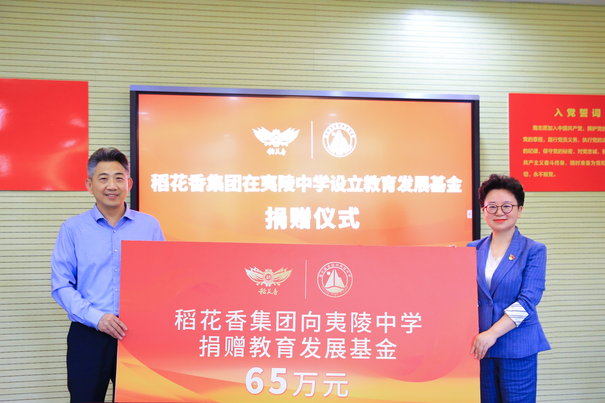 5月12日,時值夷陵中學建校60周年之際,稻花香集團在夷陵中學設立教育發展基金捐贈儀式在該校舉行,受稻花香集團董事長蔡開云委托,集團黨委副書記方麗華代表集團向夷陵中學捐贈教育發展基金65萬元,夷陵中學校長高圣奉代表學校接受捐贈。