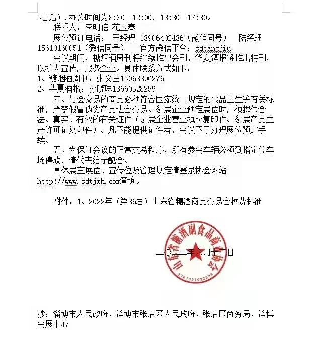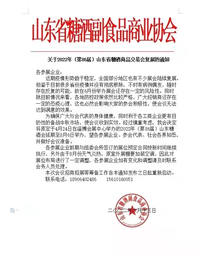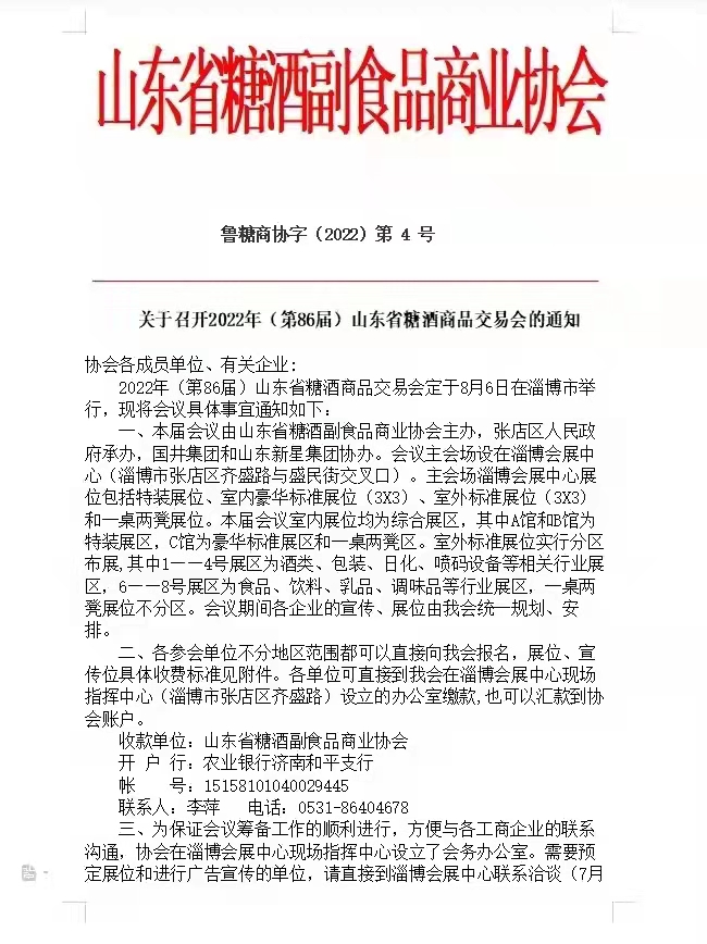 剛剛,《華夏酒報》記者從山東省糖酒副食品商業協會獲悉,2022年(第86屆)山東省糖酒商品交易會定于8月6日在淄博市舉行。本屆會議由山東省糖酒副食品商業協會主辦,張店區人民政府承辦,國井集團和山東新星集團協辦。會議主會場設在淄博會展中心(淄博市張店區齊盛路與盛民街交叉口)。