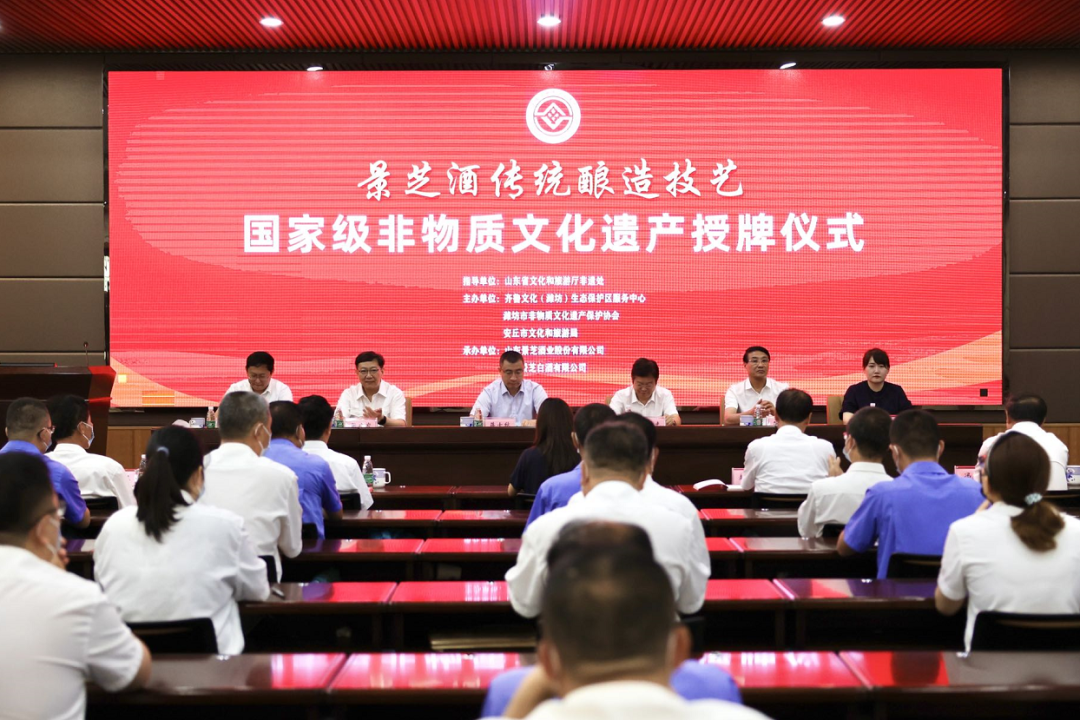7月17日,由山東省文化和旅游廳指導,齊魯文化(濰坊)生態保護區服務中心、濰坊市非物質文化遺產保護協會、安丘市文化和旅游局主辦的“景芝酒傳統釀造技藝? 國家級非物質文化遺產授牌儀式”在齊魯酒都景芝舉行。