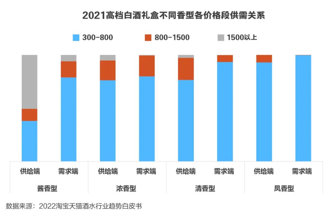 聚焦到禮盒的價格,高端白酒主流銷售價位段為300-800元;800-1500元價格段增速迅猛,潛力較大。分香型來看,醬香型白酒禮盒供給需求同比下滑,濃香、鳳香、清香型等白酒禮盒市場需求增大。濃香型在300-800元、800-1500元價格帶,清香、鳳香在300-800元價格帶,商品供給空間充足。