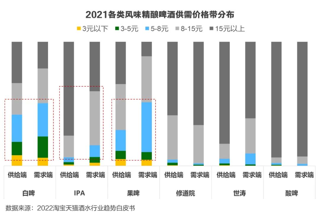 精釀啤酒因其風味多元越來越受到不同人群的喜愛,白啤是最受消費者歡迎的風味啤酒。根據2021年各類風味精釀啤酒供需價格帶分布,白啤3-8元可加大貨品供給;IPA商品多集中于15元以上,可向8-15元轉移;修道院則在15元以上存在供給機會。