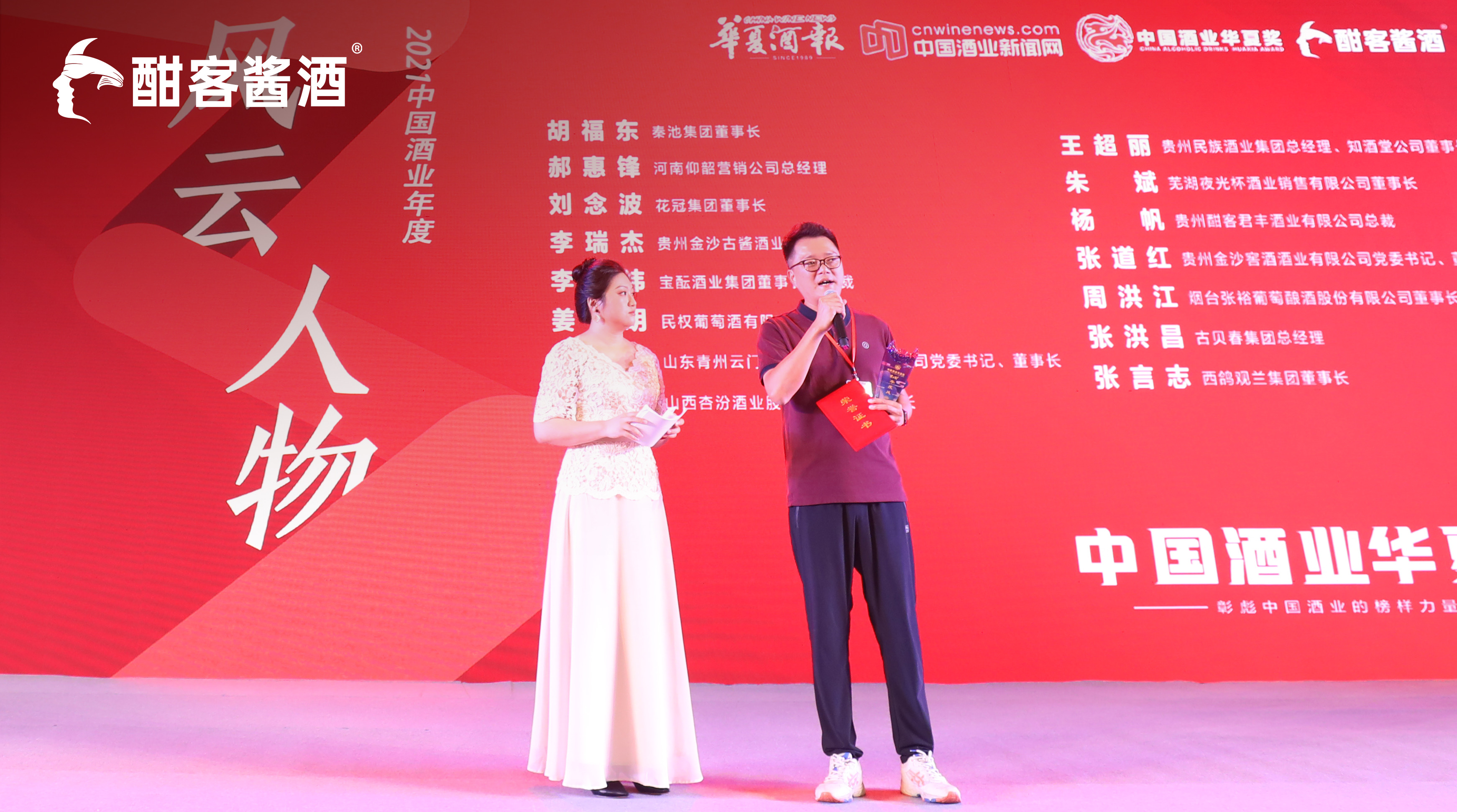 8月16日,由華夏酒報、中國酒業新聞網主辦,貴州酣客君豐酒業有限公司協辦的“釀懂中國 首屆中國酒業華夏獎”頒獎典禮在廣州朗豪酒店盛大舉行。宜賓市經濟和信息化局黨委委員、副局長李強,著名酒業文化學者、廣東省酒類行業協會創會會長朱思旭,廣東省酒類行業協會會長彭洪,四川省酒類流通協會執行會長鐵犁,福建省酒類流通協會秘書長汪慶彰,廣州市酒類行業協會會長陳鵬,《華夏酒報》總編輯吳賢國,貴州酣客君豐酒業有限公司聯合創始人莊天飛,貴州酣客君豐酒業有限公司總裁楊帆等嘉賓,以及來自全國各地的酒業經銷商和數十家獲獎企業代表共同出席了頒獎典禮。