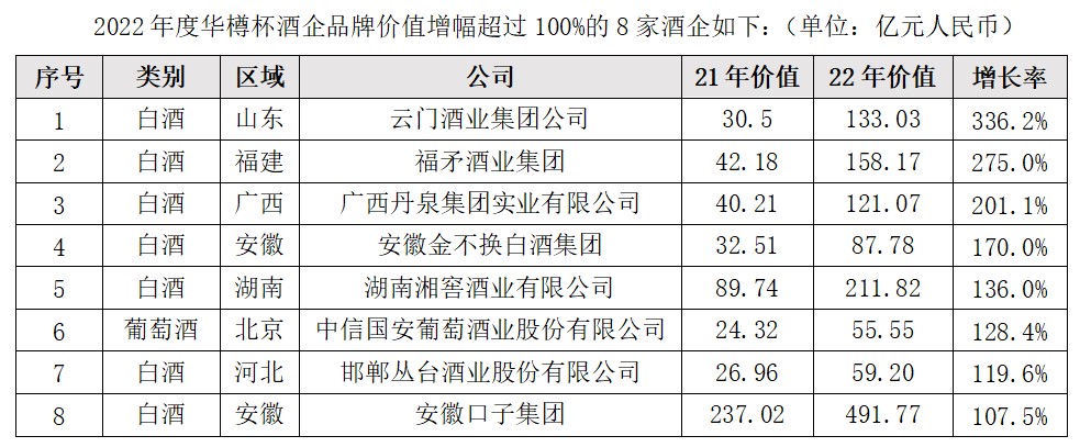 報(bào)告數(shù)據(jù)顯示,今年名列前200的酒企品牌價(jià)值酒企中,品牌價(jià)值增幅超過100%的酒企有8家,增幅30-80%的酒企18家,20-29%的酒企54家。