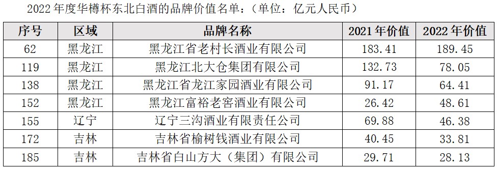 “東北酒”方面,今年總有七家入選,品牌價(jià)值總和為488.84億元,入選的酒企數(shù)量相較于前兩年越來越少,整體的品牌價(jià)值也呈現(xiàn)逐年下滑的態(tài)勢,今年的降幅為14.8%。