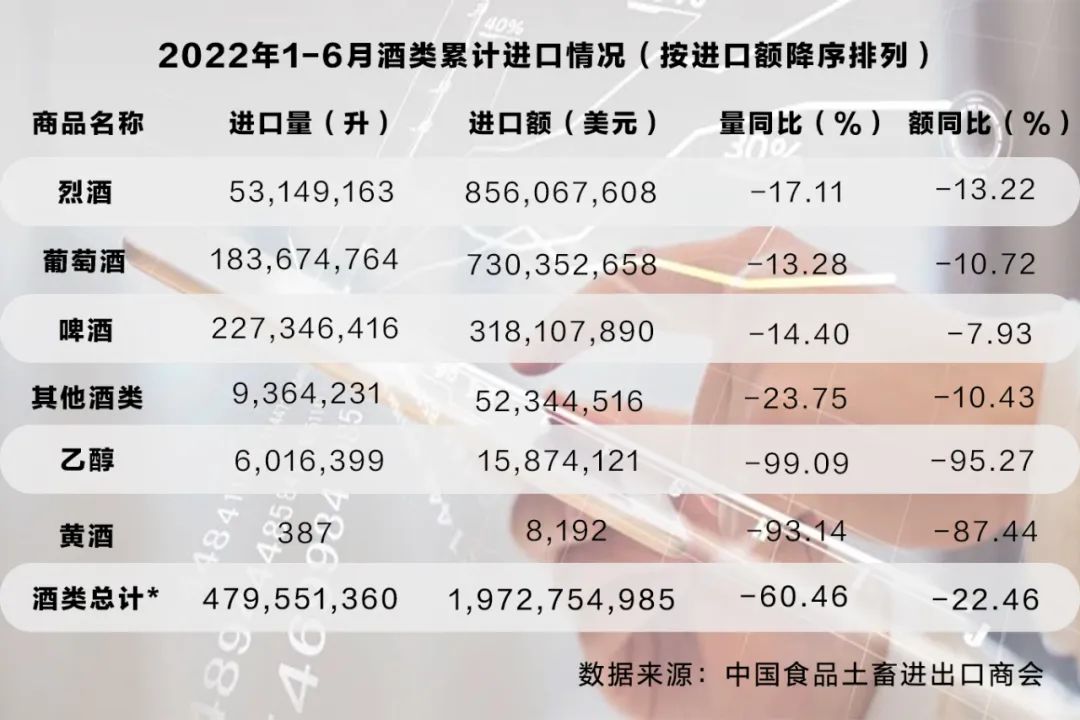 近日,中國食品土畜進出口商會酒類進出口商分會公布了《2022年1-6月進口酒類市場情況》。據統計,今年上半年,酒類累計進口量4.8億升,同比下降60.5%;累計進口額19.7億美元,同比下降22.5%。其中,葡萄酒累計進口量1.8億升,同比下降13.3%;累計進口額7.3億美元,同比下降10.7%。烈酒累計進口量5315萬升,同比下降17%;累計進口額8.6億美元,同比下降13%。
