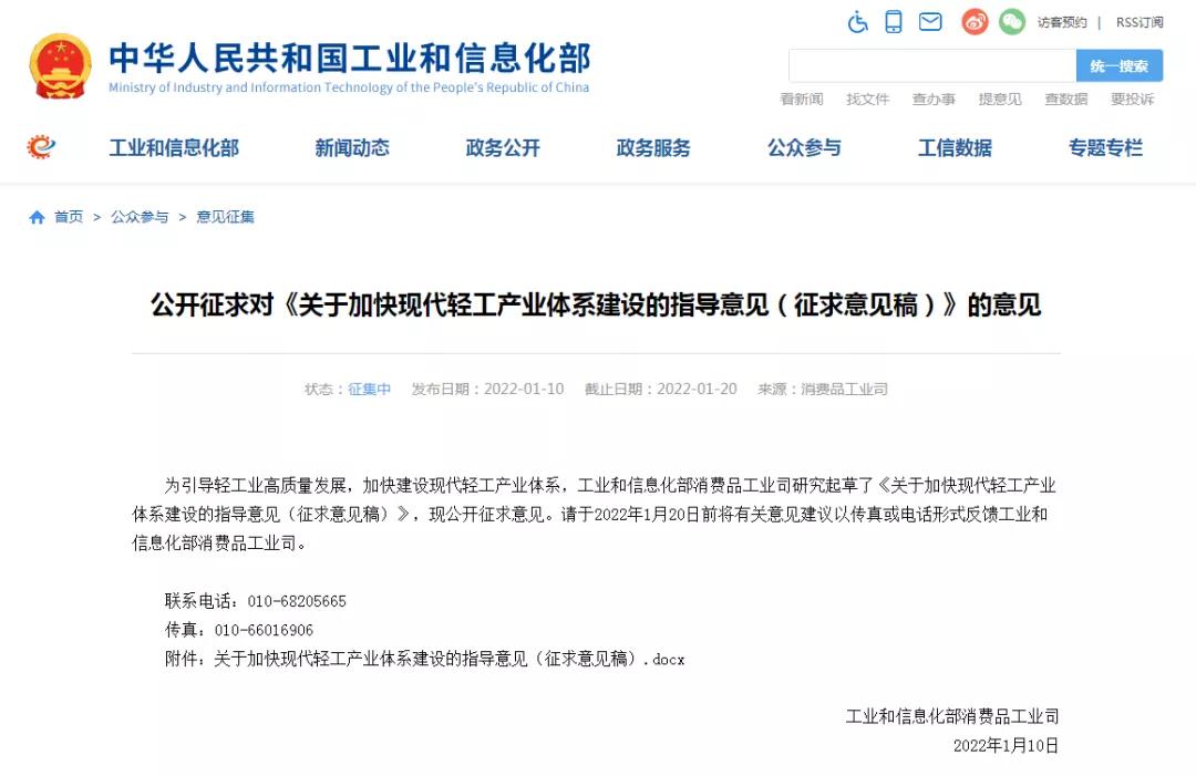 1月10日,工業和信息化部(以下簡稱“工信部”)官方網站發布了《公開征求<關于加快現代輕工產業體系建設的指導意見(征求意見稿)>》(以下簡稱《指導意見》)。