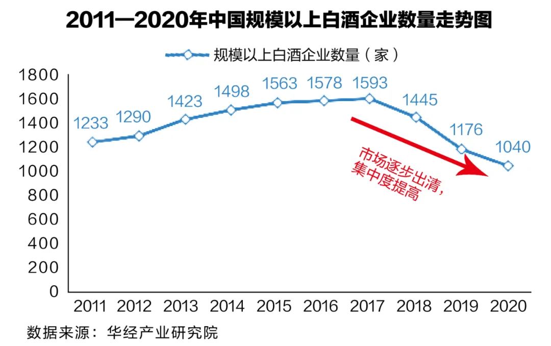 據行業數據顯示,2017年規模以上企業的數量是1593家。至2019年,規模以上企業數量減少至1176家,減少了417家,減少幅度接近三分之一。2020年1—11月,全國規模以上白酒企業1040家,數量持續減少,虧損企業170家,虧損面達到16.35%。規模以上企業數量減少,證明白酒行業集中度進一步加大,效益進一步向優勢產區和企業集中。
