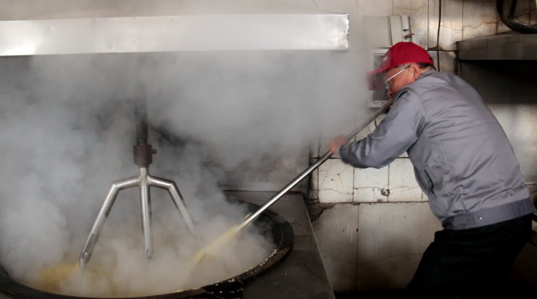 在糗糜車間,于秦峰開(kāi)啟了鏟米第一耙。接下來(lái),生產(chǎn)不忘防疫的釀酒師傅們,人人佩戴口罩,虔誠(chéng)而嫻熟地?fù)]舞著鏟耙,蒸煮、糊化、發(fā)酵、壓榨……實(shí)踐著于秦峰積累30多年生產(chǎn)經(jīng)驗(yàn)提煉出來(lái)的即墨傳統(tǒng)老酒釀造精髓——“糗糜法”。傳統(tǒng)老酒生產(chǎn)工序環(huán)環(huán)相扣,頃刻間,整個(gè)釀造車間彌漫著氤氳的熱氣和酒香,奏響了一曲蕩氣回腸又韻味無(wú)窮的“春之聲”,妙府老酒新春第一甑美酒正汩汩冒出。