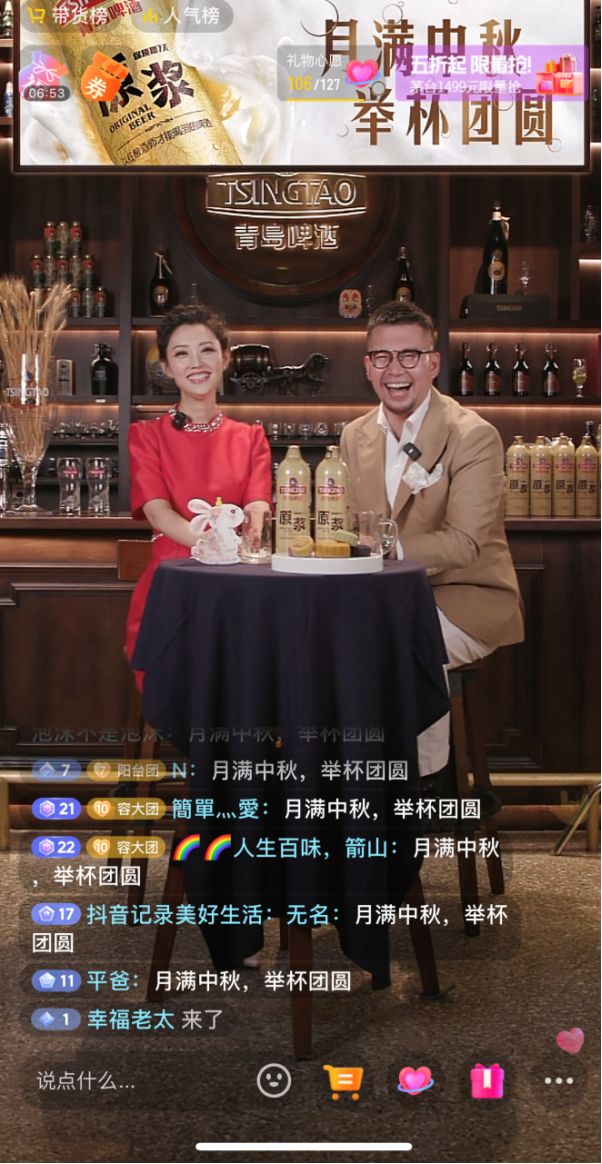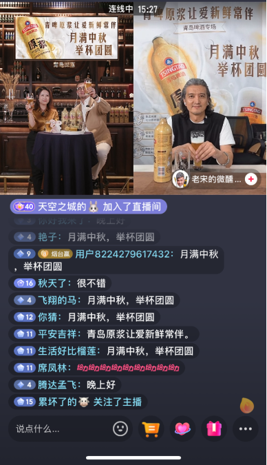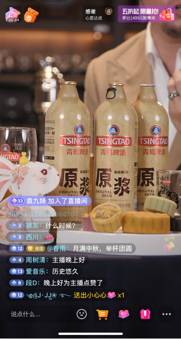 從中秋團(tuán)圓到親情保鮮,再講到一杯新鮮的青啤原漿,與這杯酒背后的人文情懷,這樣的直播方式無疑讓觀眾大呼新鮮。9月8日,青島啤酒在抖音平臺(tái)“青島啤酒官方旗艦店”進(jìn)行了“月滿中秋 舉杯團(tuán)圓 青啤原漿讓愛新鮮常伴”專場直播火了。