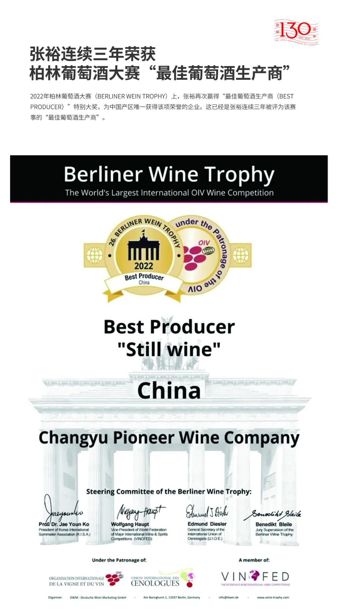 張?jiān)_B續(xù)三年獲得柏林葡萄酒大賽“最佳葡萄酒生產(chǎn)商”