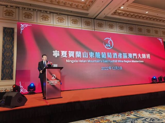 12月3日下午,寧夏賀蘭山東麓葡萄酒澳門推介活動暨寧夏賀蘭山東麓國際葡萄酒大賽大金獎酒大師班在澳門巴黎人宴會廳舉辦。這是寧夏賀蘭山東麓葡萄酒產區首次大規模亮相澳門并舉辦大師班推介活動。
