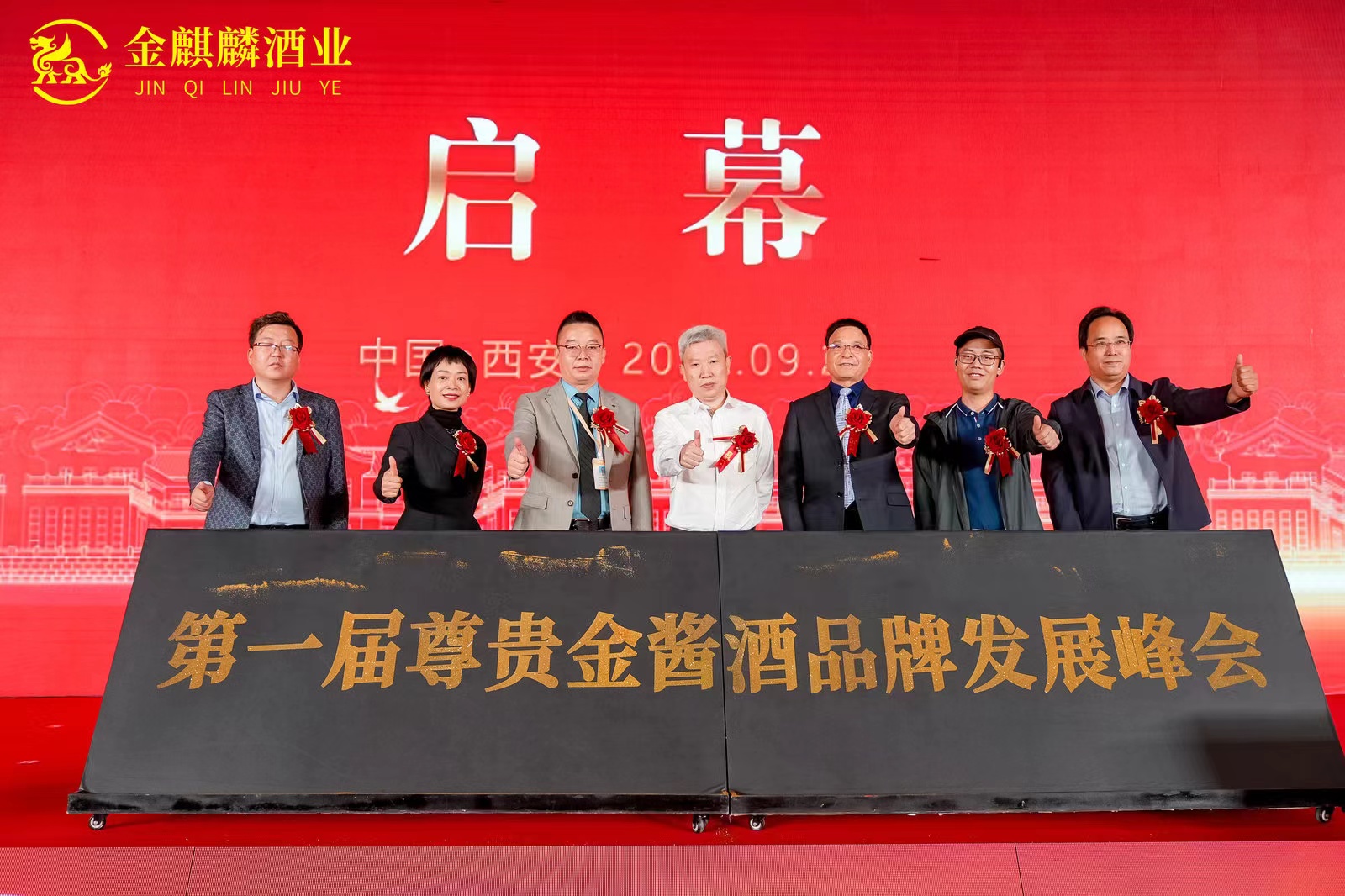 中國醬香酒釀造大師、大國醬香領軍人物、汪家燒坊傳承人、金醬酒業有限公司董事長汪洪彬,金醬酒業有限公司副董事長曾貴平,貴州省白酒企業商會副秘書長、資深醬酒專家周山榮,陜西省糖酒副食流通協會會長宣保國,陜西省糖酒副食有限公司總經理葛堯,陜西省糖酒副食流通協會副會長、食品新觀察雜志總編劉強,陜西金麒麟酒業營銷策劃有限公司總經理徐志剛為“第一屆尊貴金醬酒品牌發展峰會”啟幕。