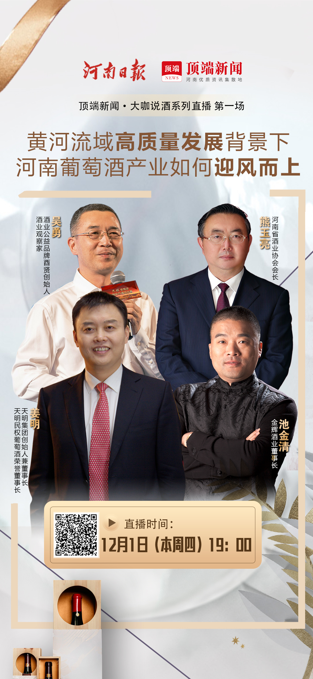 2022年12月1日19:00-21:30,河南省酒業(yè)協(xié)會(huì)會(huì)長(zhǎng)熊玉亮,酒業(yè)公益品牌酉賢創(chuàng)始人、酒業(yè)觀察家吳勇,天明集團(tuán)創(chuàng)始人兼董事長(zhǎng)、天明民權(quán)葡萄酒榮譽(yù)董事長(zhǎng)姜明,金輝酒業(yè)董事長(zhǎng)池金清等酒業(yè)大咖,在線連麥共話黃河流域高質(zhì)量發(fā)展背景下,河南葡萄酒產(chǎn)業(yè)如何迎風(fēng)而上,共同把脈解讀黃河故道產(chǎn)區(qū)振興和民權(quán)葡萄酒發(fā)展!