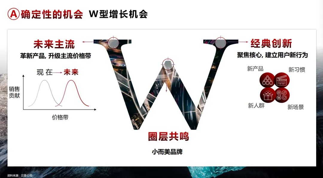 “W”型增長機會,首先是經典創新,聚焦核心業務,根據消費者改變的需求,創造新產品、擴展新人群、建立新習慣和打造新場景;第二個機會是未來主流,新的主流價格帶就是未來的市場機會點,隱富人群的消費升級+都市夾心的消費降級共同作用推動了新的增長機會;W底部是圈層共鳴小而美品牌,誰能和目標消費群產生共鳴,誰就有機會抓住增長的機會。