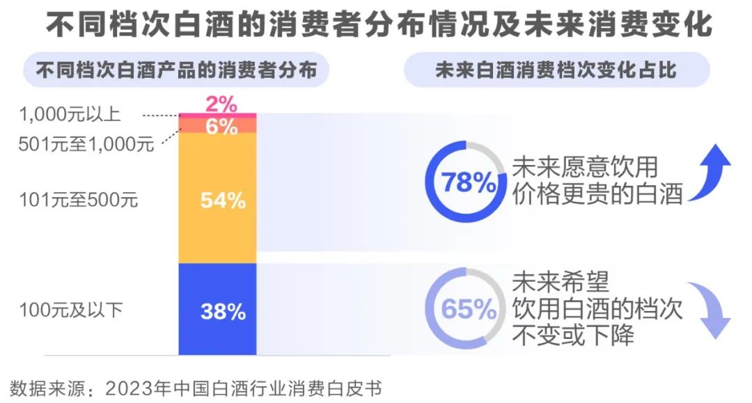 《白皮書》統(tǒng)計(jì)數(shù)據(jù)顯示,隨著市場(chǎng)的復(fù)蘇,白酒消費(fèi)檔次進(jìn)一步呈現(xiàn)價(jià)位兩極分化。從購(gòu)買不同白酒價(jià)位的消費(fèi)者比例顯示,大部分消費(fèi)者更傾向購(gòu)買101元至500元價(jià)位的產(chǎn)品,這一占比為54%;其次是百元以內(nèi)塔基產(chǎn)品的群體,占比38%,但這一價(jià)位的群體未來(lái)消費(fèi)升級(jí)的意愿較弱,65%的人群表示,未來(lái)一年白酒檔次將維持甚至有所下降。而500元以上檔位產(chǎn)品的消費(fèi)人群雖比例不高(8%),但呈現(xiàn)出更強(qiáng)的檔次韌性,其未來(lái)消費(fèi)升級(jí)的意愿隨現(xiàn)有白酒消費(fèi)檔次的升高而增加(78%)。