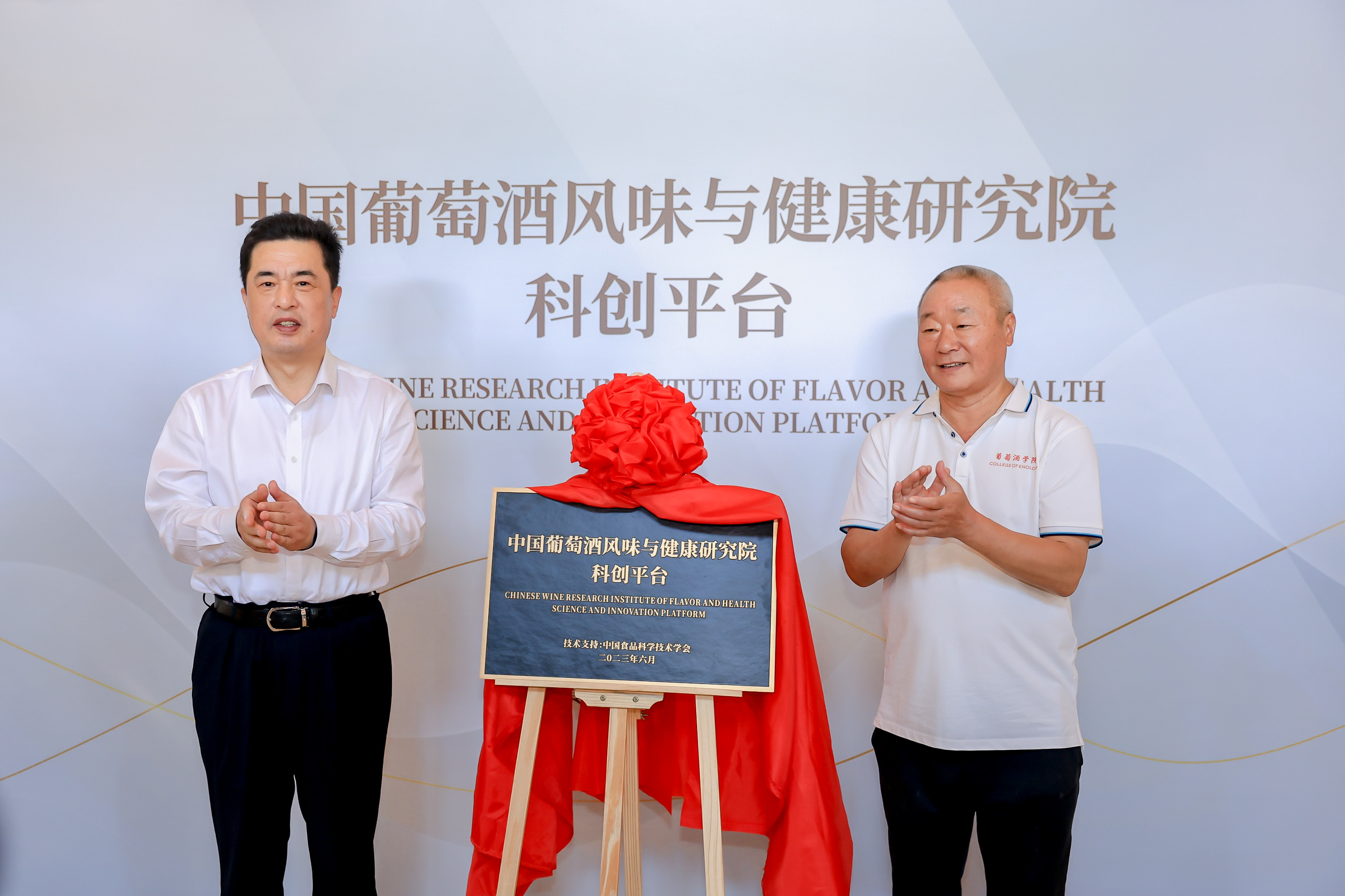 煙臺市政協主席、煙臺葡萄酒產業鏈鏈長于永信先生(左)與中國食品科學技術學會葡萄酒分會理事長李華教授(右)共同為中國葡萄酒風味與健康研究院科創平臺揭牌