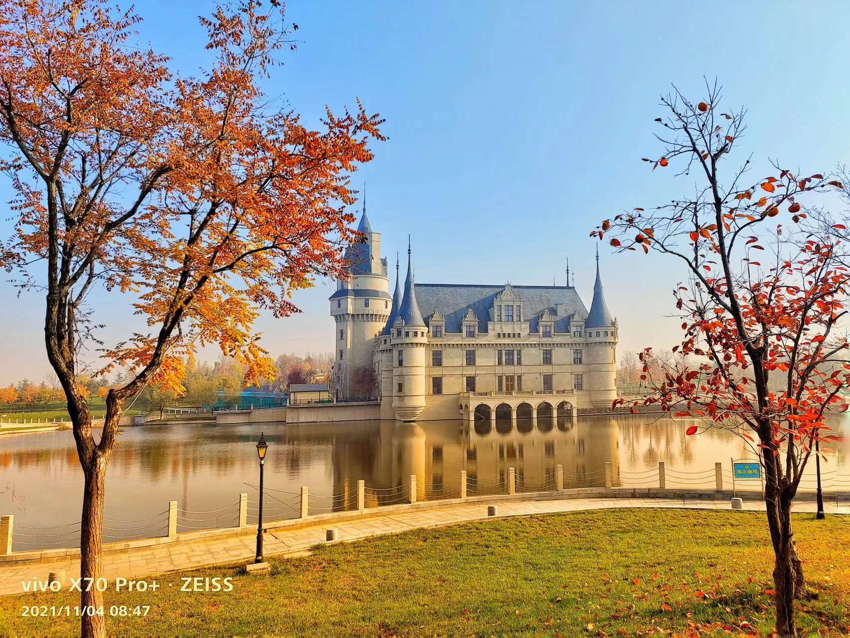 粼粼湖光映照著高聳尖頂,與遠處的葡萄園相映成畫。