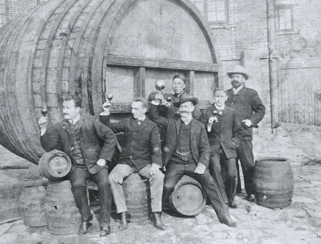 張?jiān)J兹慰偨?jīng)理張成卿(第二排左一)與眾多釀酒師舉杯慶祝中國第一桶白蘭地誕生。