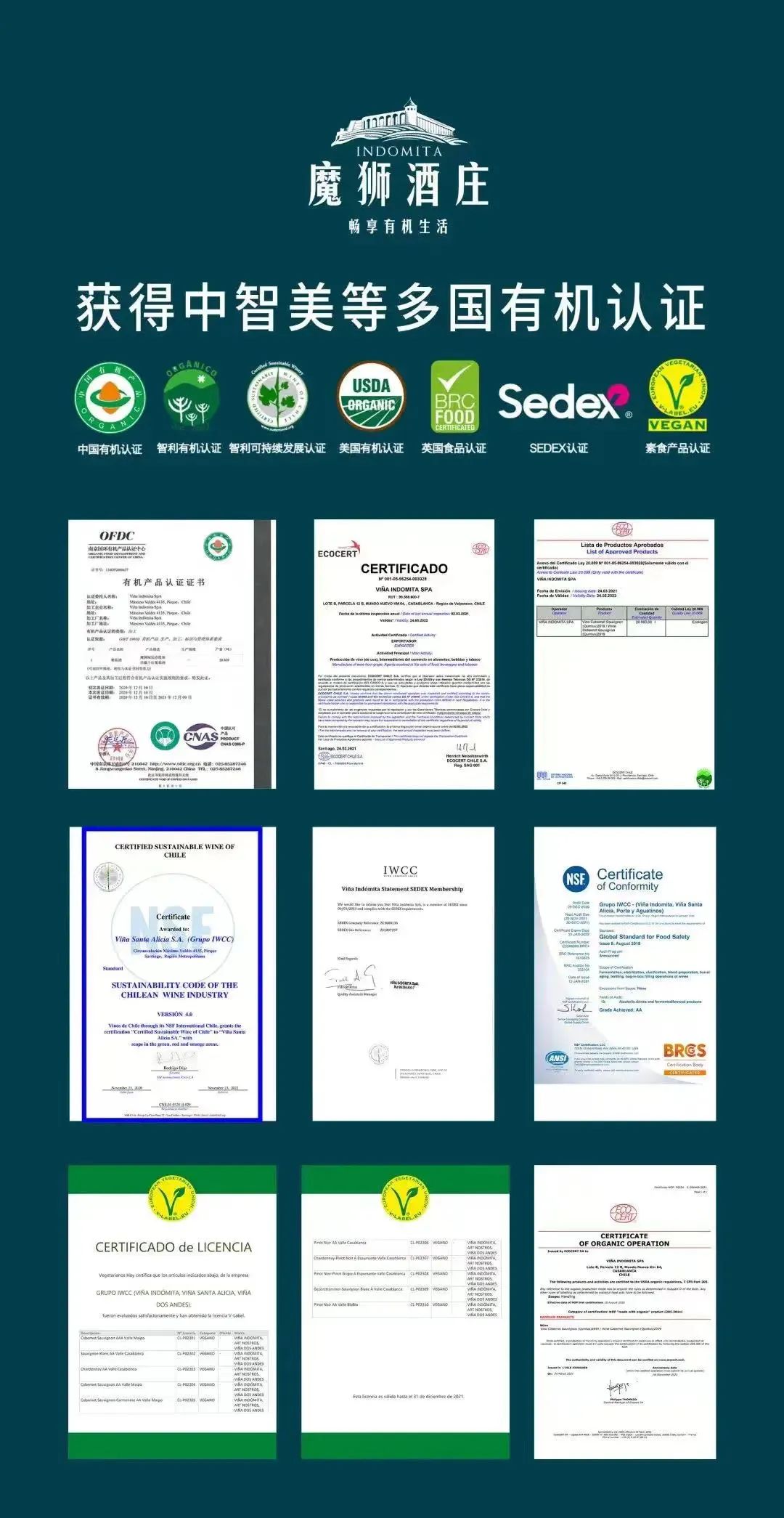 目前,魔獅酒莊已經(jīng)獲得包括中國有機認(rèn)證、智利有機認(rèn)證、美國農(nóng)業(yè)部有機認(rèn)證(USDA)、英國零售商協(xié)會食品認(rèn)證(BRC)等在內(nèi)的多項國際有機領(lǐng)域方面的權(quán)威認(rèn)證。