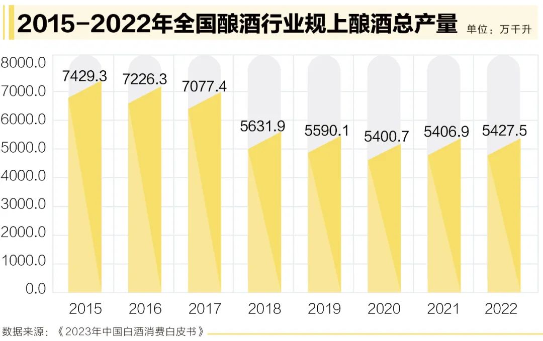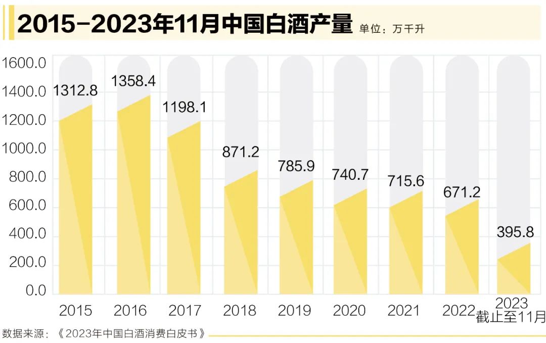 單就白酒來看,國家統(tǒng)計(jì)局?jǐn)?shù)據(jù)顯示,中國白酒產(chǎn)量自2016年以來已經(jīng)出現(xiàn)六連降,2022年全國規(guī)模以上白酒企業(yè)產(chǎn)量為671.24萬千升,同比下降5.58%;2023年1-11月,全國規(guī)模以上白酒企業(yè)產(chǎn)量為395.8萬千升,同比下降6.0%。
