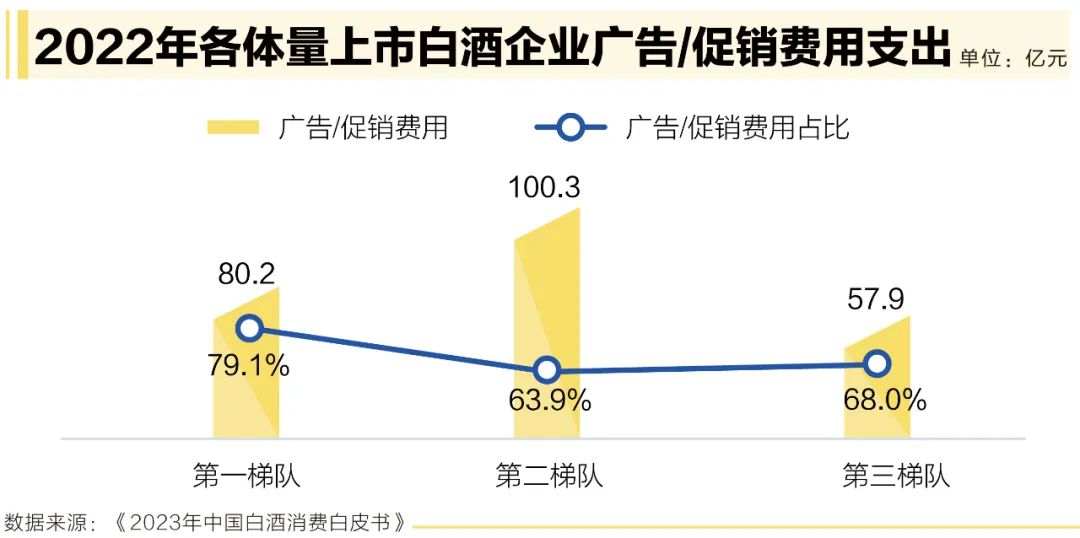 據(jù)統(tǒng)計(jì),貴州茅臺、五糧液、瀘州老窖、山西汾酒、洋河股份、古井貢酒、今世緣、迎駕貢酒、舍得酒業(yè)、水井坊、酒鬼酒、老白干酒、順鑫農(nóng)業(yè)、金徽酒、伊力特、天佑德等16家上市白酒企業(yè)2022年銷售費(fèi)用達(dá)343.5億元,同比增長9.89%;其中,廣告/促銷費(fèi)用為238.3億元,同比增長12.86%;廣告/促銷費(fèi)用占銷售費(fèi)用的比例為69.4%,同比增長1.8%。