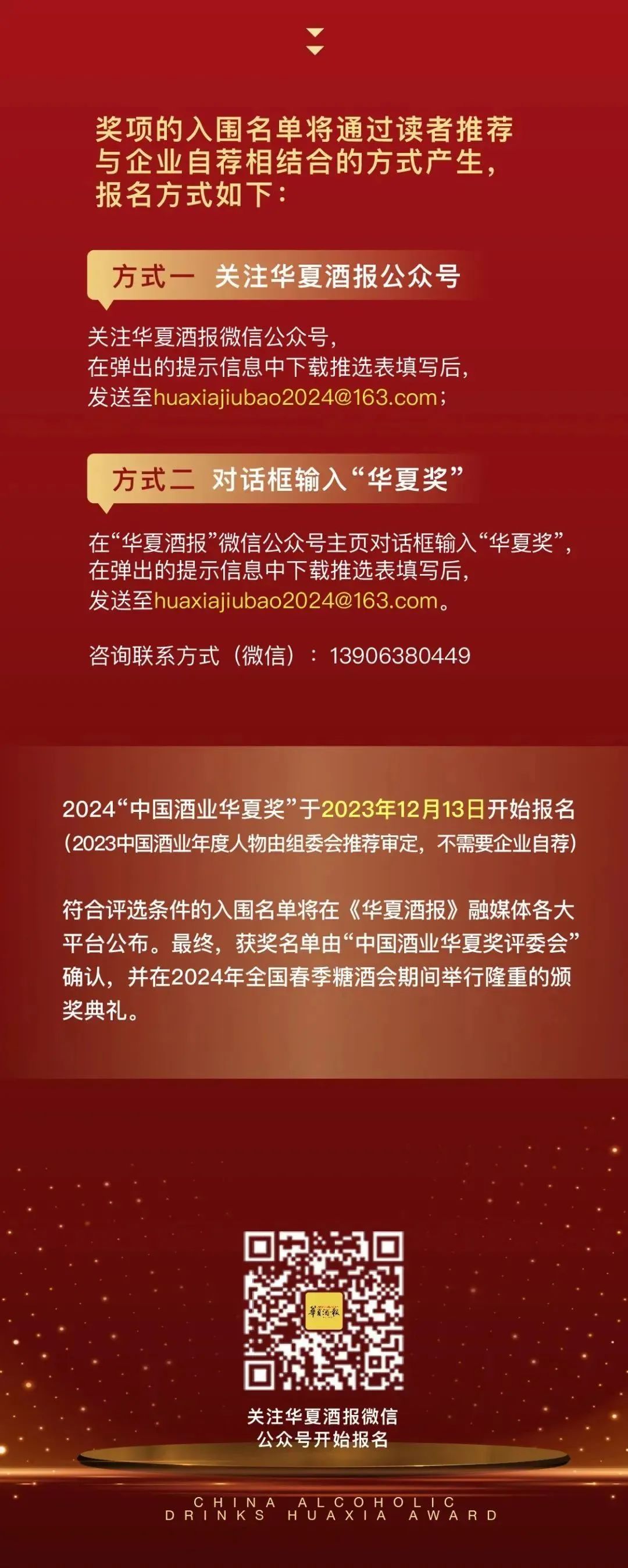 符合評選條件的入圍名單將在《華夏酒報》融媒體各大平臺公布,報名截至3月10日。最終,獲獎名單將由“中國酒業華夏獎評委會”確認,并在第110屆全國糖酒商品交易會期間舉辦的2024“中國酒業華夏獎”頒獎盛典上發布。
