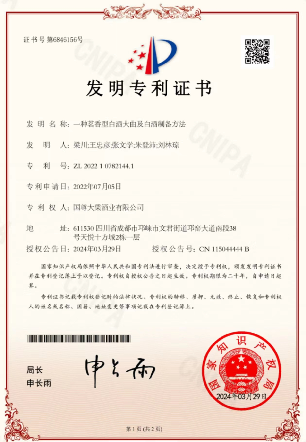 3月29日,大梁酒業(yè)公司經(jīng)過國家知識產(chǎn)權(quán)局的嚴(yán)格審查,成功獲得了其茗香型白酒大曲及白酒制備方法的發(fā)明專利權(quán)。這一發(fā)明成果不僅確認(rèn)了大梁酒業(yè)在茗香型白酒細(xì)分市場的領(lǐng)先地位,更為企業(yè)的長遠(yuǎn)發(fā)展構(gòu)筑了堅實的技術(shù)壁壘和核心競爭力。