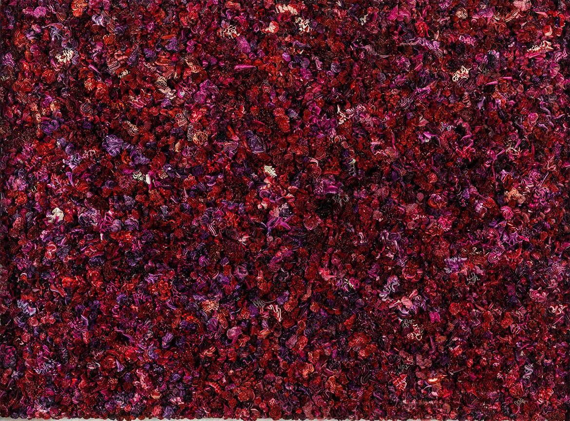 美賀莊園將三位藝術(shù)家的代表作與紅酒設(shè)計(jì)融為一體。徐震最著名的繪畫系列之一《天下》,曾作為紐約軍械庫(kù)藝術(shù)博覽會(huì)的重點(diǎn)作品,受到廣泛推崇。畫作中“奶油”成為一種意象,凝結(jié)后的彩色顏料形成了高低錯(cuò)落的狀態(tài),構(gòu)成了一個(gè)充滿奇思與遐想的微縮景觀,猶如熟透后的釀酒葡萄,在發(fā)酵過(guò)程中浸漬萃取,保留色素與風(fēng)味物質(zhì),深深淺淺的紅色是令人生津的色澤,與《天下-2902KP1149》中奶油花形攪拌融合在巴洛克風(fēng)格的雕花叢林里,呈現(xiàn)出一幅立體生動(dòng)的藝術(shù)畫作。