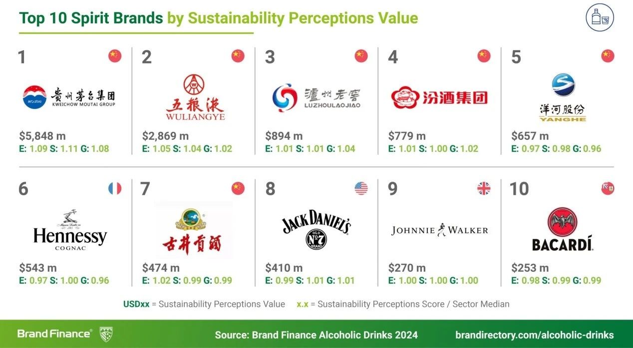 Brand Finance還利用旗下的全球品牌資產監測機構(GBEM)研究編制了“可持續發展感知指數(Sustainability Perceptions Index)”。值得一提的是,在該榜單的前10位中,中國白酒品牌占了6個。其中,茅臺以58.48億美元的可持續發展感知價值領先;五糧液以28.69億美元位列第二;瀘州老窖以8.94億美元位列第三;汾酒、洋河、古井貢酒分別以7.79億美元、6.57億美元、4.74億美元位列第四、第五、第七。