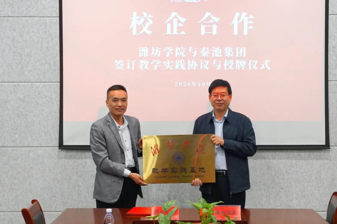 隨后,濰坊學院傳媒學院院長韓殿元與集團黨委副書記、工會主席魏學峰共同簽署《教學實踐基地協議書》;濰坊學院傳媒學院院長韓殿元向秦池授濰坊學院教學實踐基地牌。