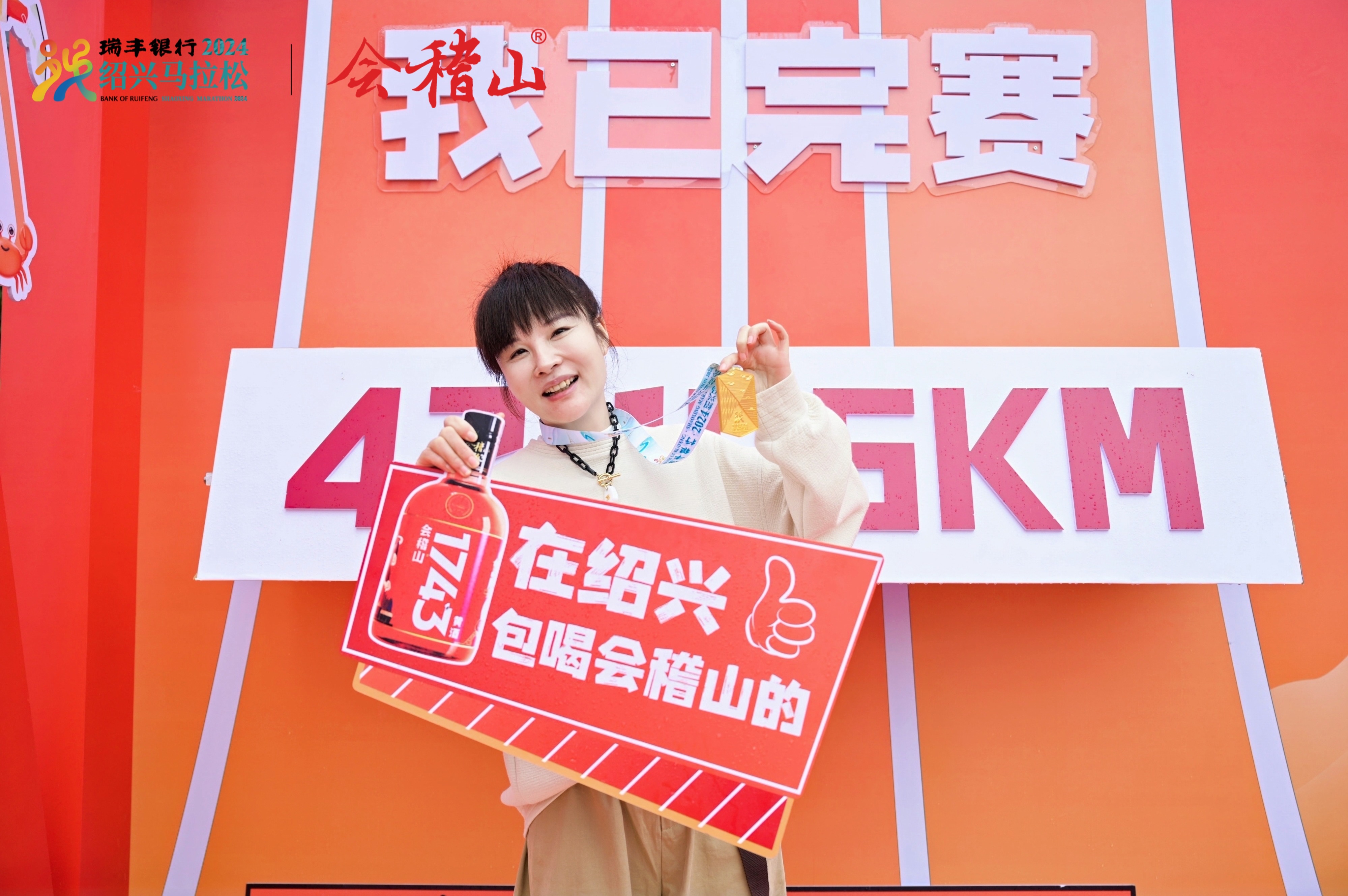 在馬拉松的賽后區域,一個巨大的1743酒瓶巋然矗立,再加上以紅色為主色調的會稽山展臺,顯得格外奪目。完成了長途奔跑的運動員從終點線跨出后,紛紛被吸引至此。