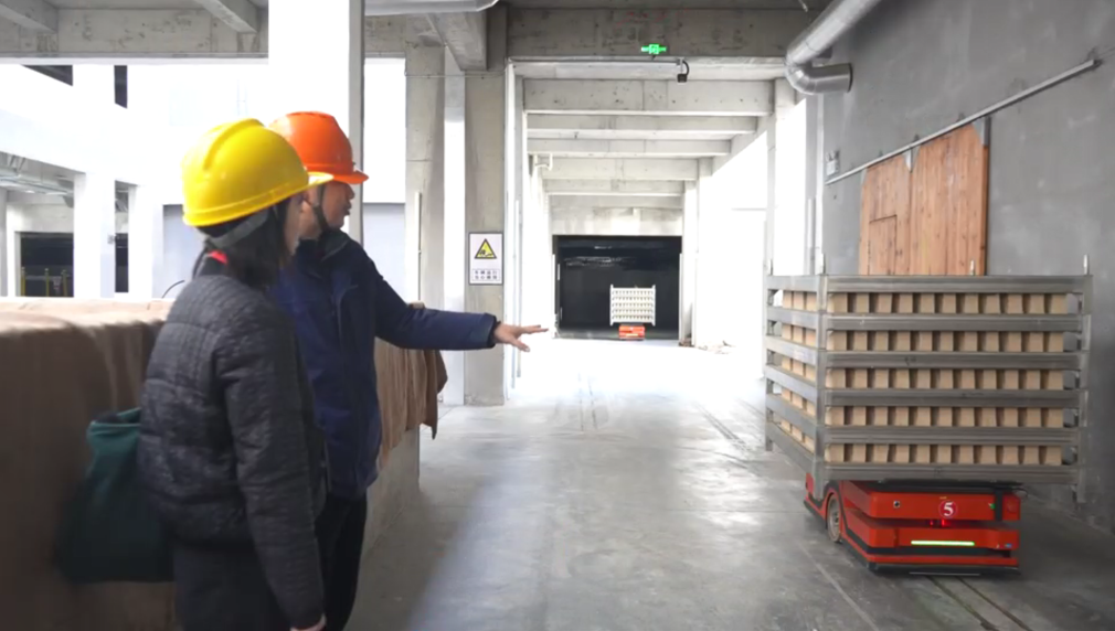 古井貢酒股份有限公司智能園釀造四部制曲車間副主任朱林介紹:“小車通過5G信號與中控進行信號交互,然后與中控進行信號對接,由中控下達指令,小車去執行任務。一輛小車每次可以拉一組曲架,每天總共有4房出入房任務,生產效率比傳統車間要高一倍左右。”