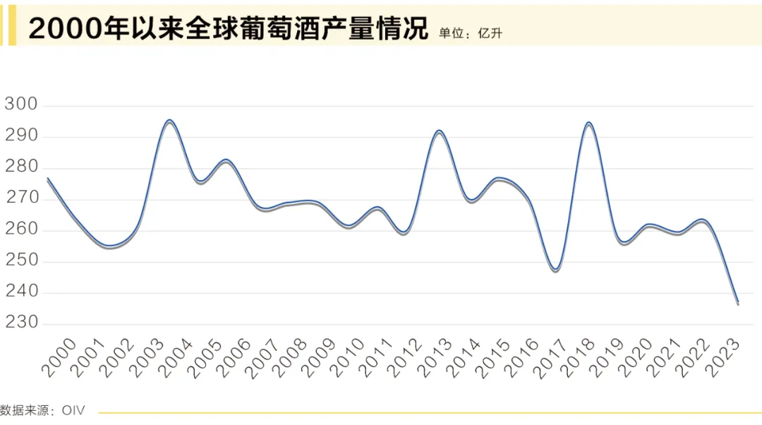 2023年,南半球的低產量、高出口均價和國際需求下降影響了全球葡萄酒出口量,全球葡萄酒出口量下降6.3%至99.3億升,為2010年以來的最低紀錄。