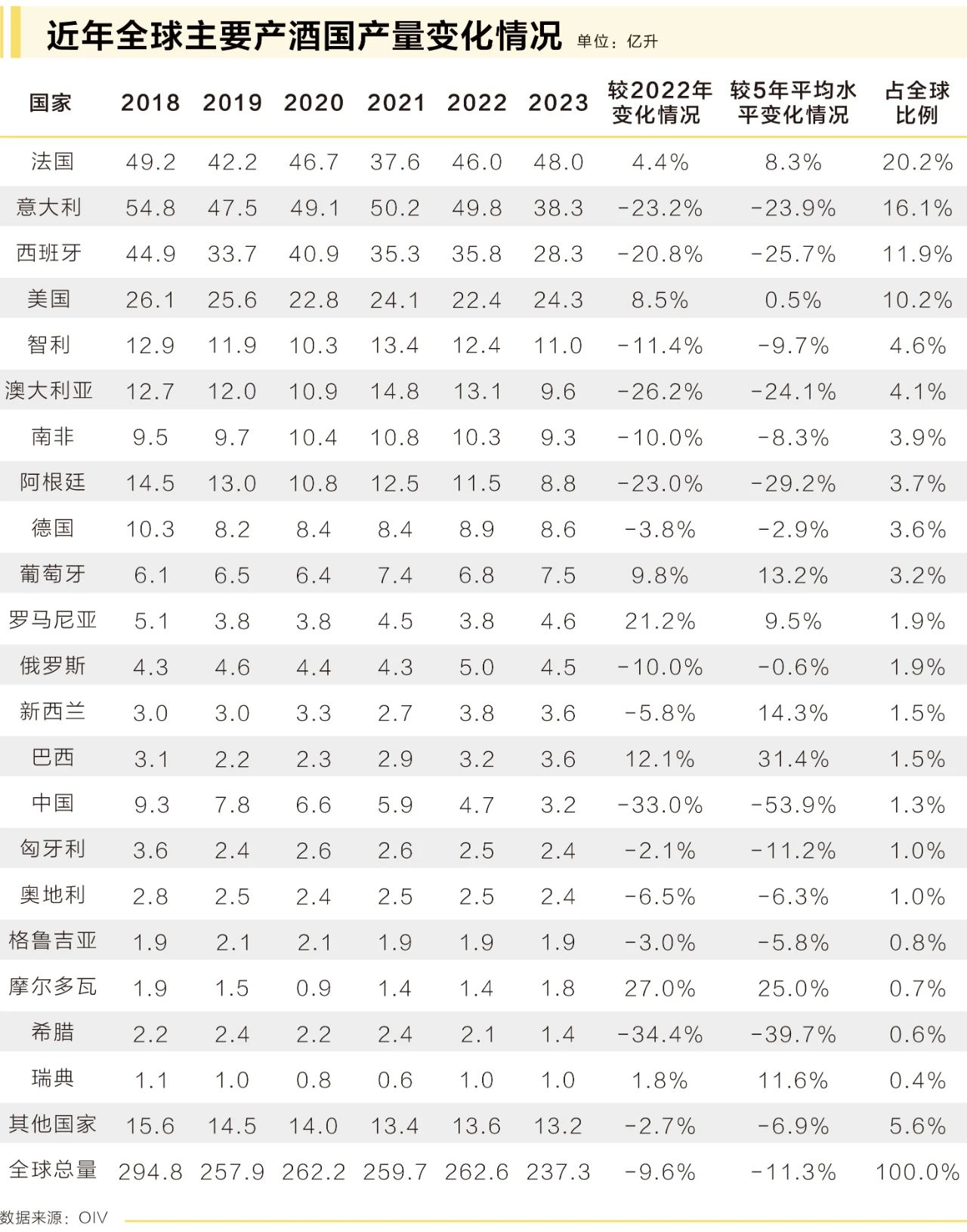 2023年,全球葡萄酒產量(不包括果汁和果醬)估計為237億升,與2022年相比顯著減少近25億升,下降9.6%。在連續四年保持20年平均產量水平后,2023年的產量是自1961年(214億升)以來的最低值。這種急劇下降可歸因于不利氣候條件的共同作用,包括早霜、暴雨和干旱,以及廣泛的真菌病害,這些因素嚴重影響了南北半球主要葡萄酒產區的產量。