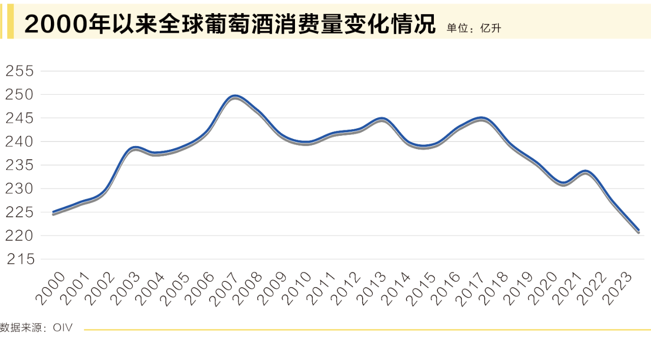 伴隨著消費者購買力下降,2023年全球葡萄酒消費量預估為221億升,下降2.6%,這或將是1996年以來記錄的最低值。