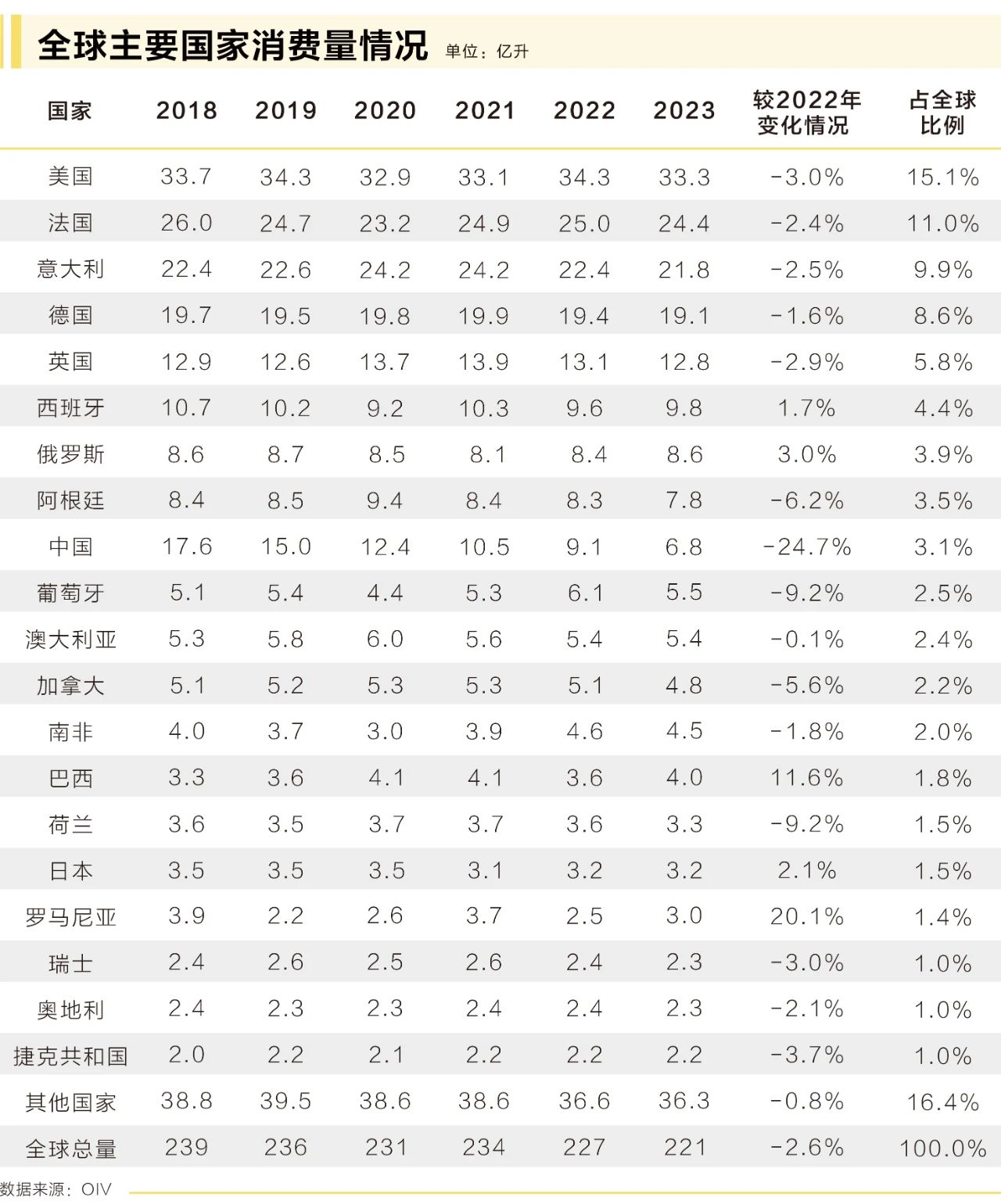 在全球最大的葡萄酒市場美國,2023年的消費量下降了3%,達到33.3億升;加拿大的消費量為4.8億升,與2022年相比下降了5.6%,這是自2016年以來總消費量首次降至5.4億升以下。