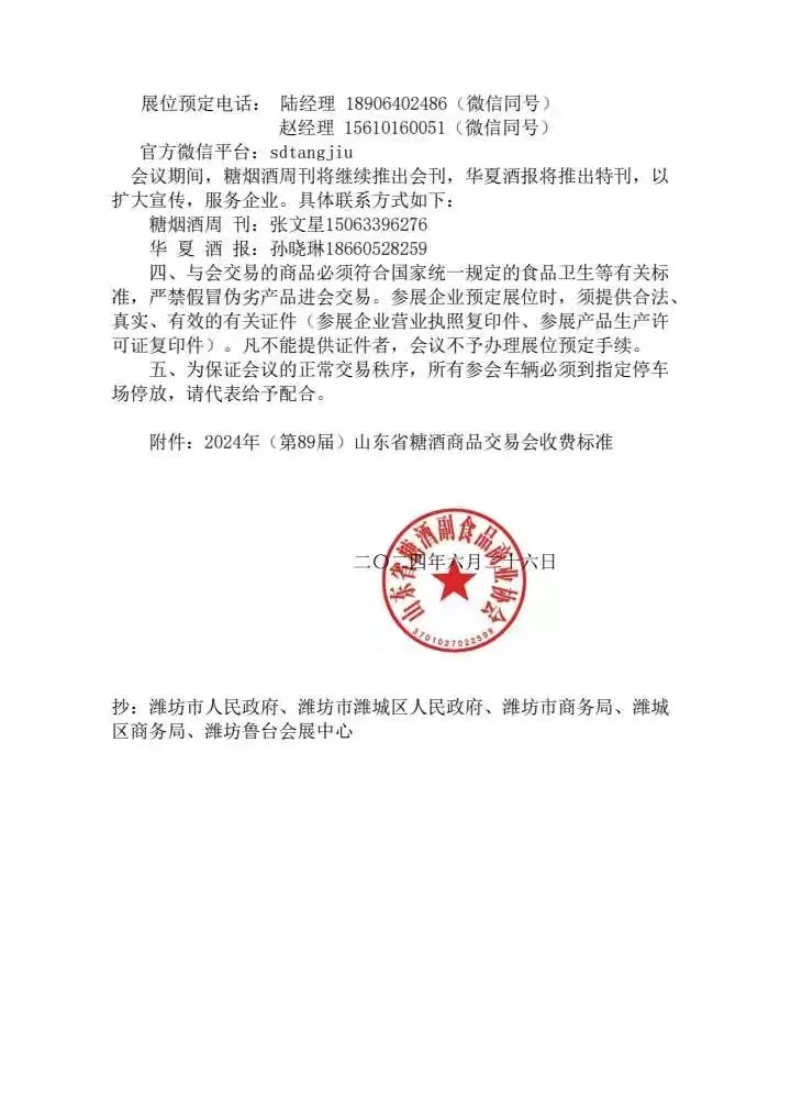 三、為保證會議籌備工作的順利進行,方便與各工商企業(yè)的聯(lián)系溝通,協(xié)會在濰坊魯臺會展中心設立了會務辦公室。需要預定展位和進行廣告宣傳的單位,請直接到魯臺會展中心聯(lián)系洽談(7月3日以后,辦公時間為8:30——12:00,14:30——18:00),也可通過電話、微信等方式聯(lián)系預定。展位預定電話:陸經(jīng)理 18906402486(微信同號)趙經(jīng)理 15610160051(微信同號)官方微信平臺:sdtangjiu