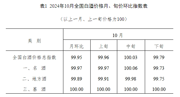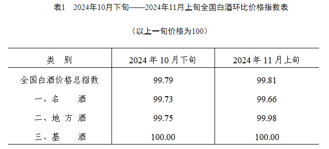 隨著三季報相繼披露,白酒行業格局也悄然發生著變化,呈現出業績分化明顯、增速略顯放緩等趨勢。11月8日、11月11日,瀘州·中國白酒商品批發價格指數辦公室先后發布了《2024年10月全國白酒價格指數走勢分析》以及《2024年11月上旬瀘州·中國白酒商品批發價格走勢》,對10月以及11月上旬白酒、名酒、地方酒、基酒價格及走勢等進行了分析。據全國白酒價格調查資料顯示,10月份,全國白酒批發價格環比總指數為99.95,下跌0.05%。分類來看,名酒環比價格指數下跌0.03%,地方酒環比價格指數下跌0.11%,基酒價格環比指數保持穩定。11月上旬,全國白酒環比價格總指數為99.81,下跌0.19%。從分類指數看,名酒環比價格指數為99.66,下跌0.34%;地方酒環比價格指數為99.98,下跌0.02%。基酒環比價格指數為100.00,保持穩定。從定基價格指數看,11月上旬全國白酒商品批發價格定基總指數為110.20,上漲10.20%。其中,名酒定基價格指數為113.01,上漲13.01%;地方酒定基價格指數為105.43,上漲5.43%;基酒定基價格指數為110.12,上漲10.12%。
