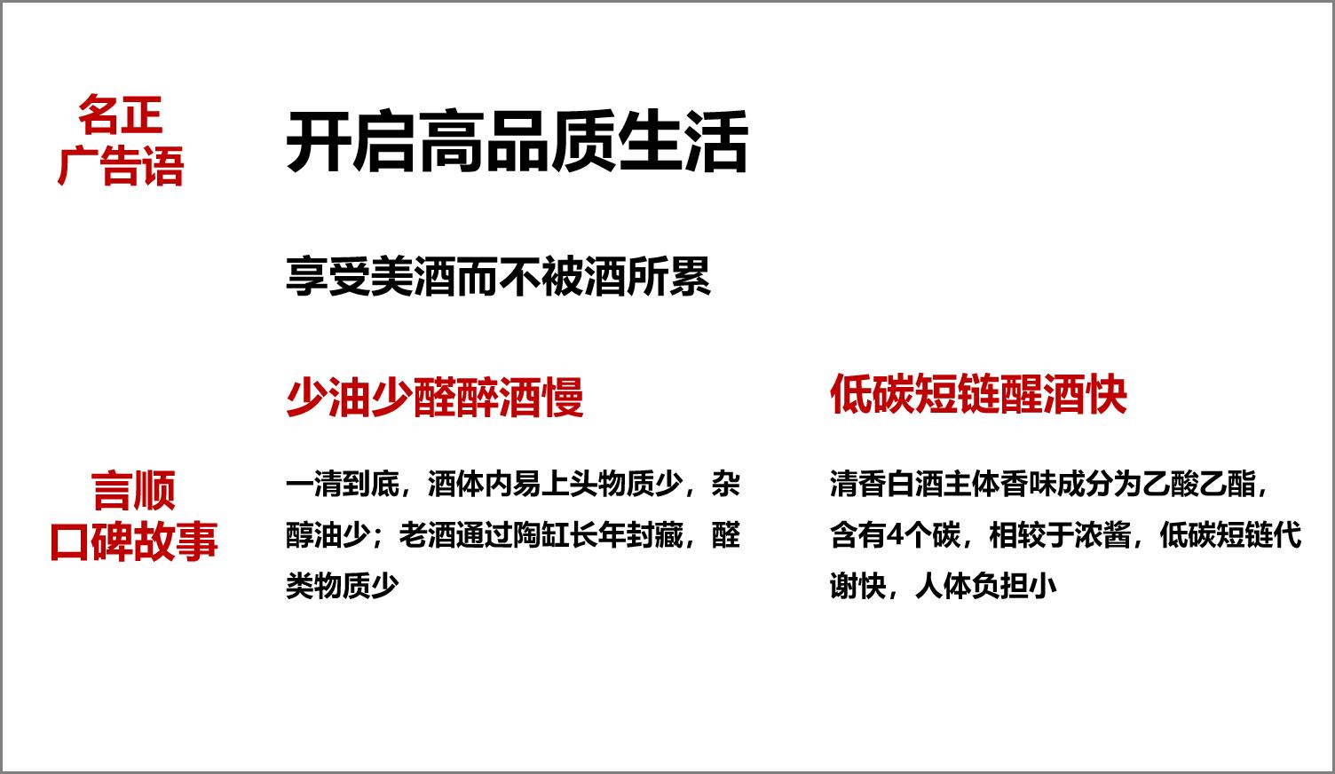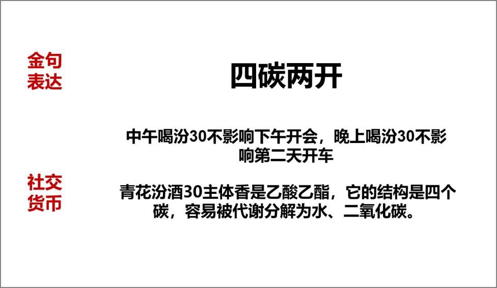所有用戶關(guān)心的都是與自己有關(guān)的“利益點(diǎn)”,生理可體驗(yàn)、邏輯可證明的品質(zhì)是“果”,分為飲前聞香、飲中入口、飲后體感;帶給消費(fèi)用戶的每個(gè)“利益點(diǎn)”必定有相應(yīng)的支撐點(diǎn),這是“因”,因果要一一匹配,成雙成對(duì)出現(xiàn),形成邏輯自洽,此謂“因果自洽”(以青花汾酒為例)。