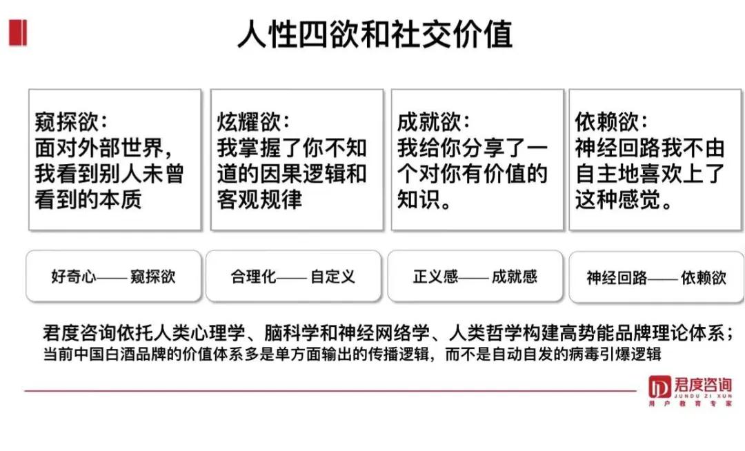 品質(zhì)和故事,茅臺(tái)封神兩大利器的背后是白酒的第一性原理——“白酒的本質(zhì)在人不在物,在主體不在客體”,人性中有窺探欲、炫耀欲、成就欲和依賴欲,這四種欲望疊加,表現(xiàn)在社交中的情緒價(jià)值,如下圖所示: