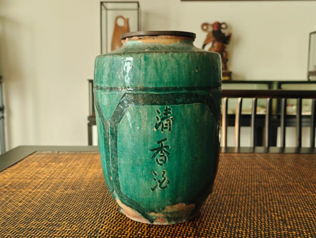 另一件重器也是湖南銅官窯孔雀綠的大酒壇,這個酒壇更為稀缺,因為酒壇上刻有“清香酒”三個字。大家都知道,在第三屆全國評酒會之前,中國白酒是沒有香型劃分的。那么,這個酒壇上的“清香酒”是什么含義呢?