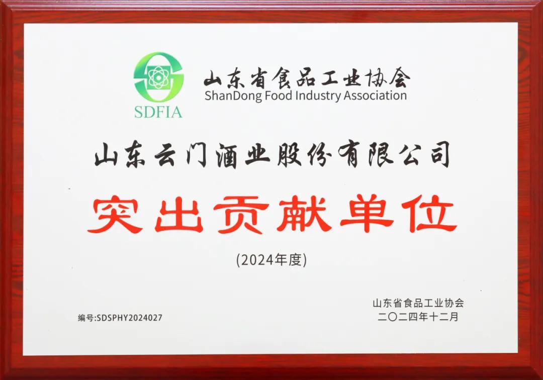 云門酒業憑借強大的綜合發展實力榮獲“山東省食品工業協會突出貢獻單位”稱號。這不僅是對云門多年匠心堅守、品質釀造的認可,更是對云門酒業在山東食品產業發展過程中貢獻的肯定。