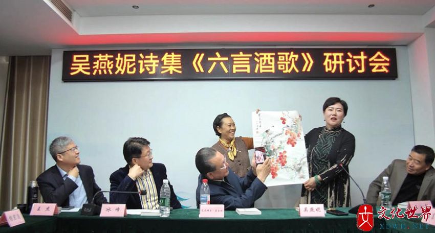 《作家報》總編輯張富英在發(fā)言時說,酒者,一般來說男人專愛;女人歌之,已成一奇;女性歌之成書,更是奇葩;且六言集成,則有令男兒汗顏的意味了。知燕妮是山東小老鄉(xiāng),如此“壯舉”,我可自豪地說:唯山東姑娘可為焉!聆聽前面幾位方家品評,特別是聽了詩人自陳創(chuàng)作心語,不禁感念:把酒言歡,把酒嘆平生,把酒話桑麻.....言為心聲,詩品如人品,燕妮最可貴處真性情也。舊體詩六言最難,且莫說韻,講求對仗,很受局限,為表情達(dá)意,便會不那么工整講究。律詩多為五言七言,單多出一字便能拉開張力,不難理解散句就顯出這方面的優(yōu)勢。